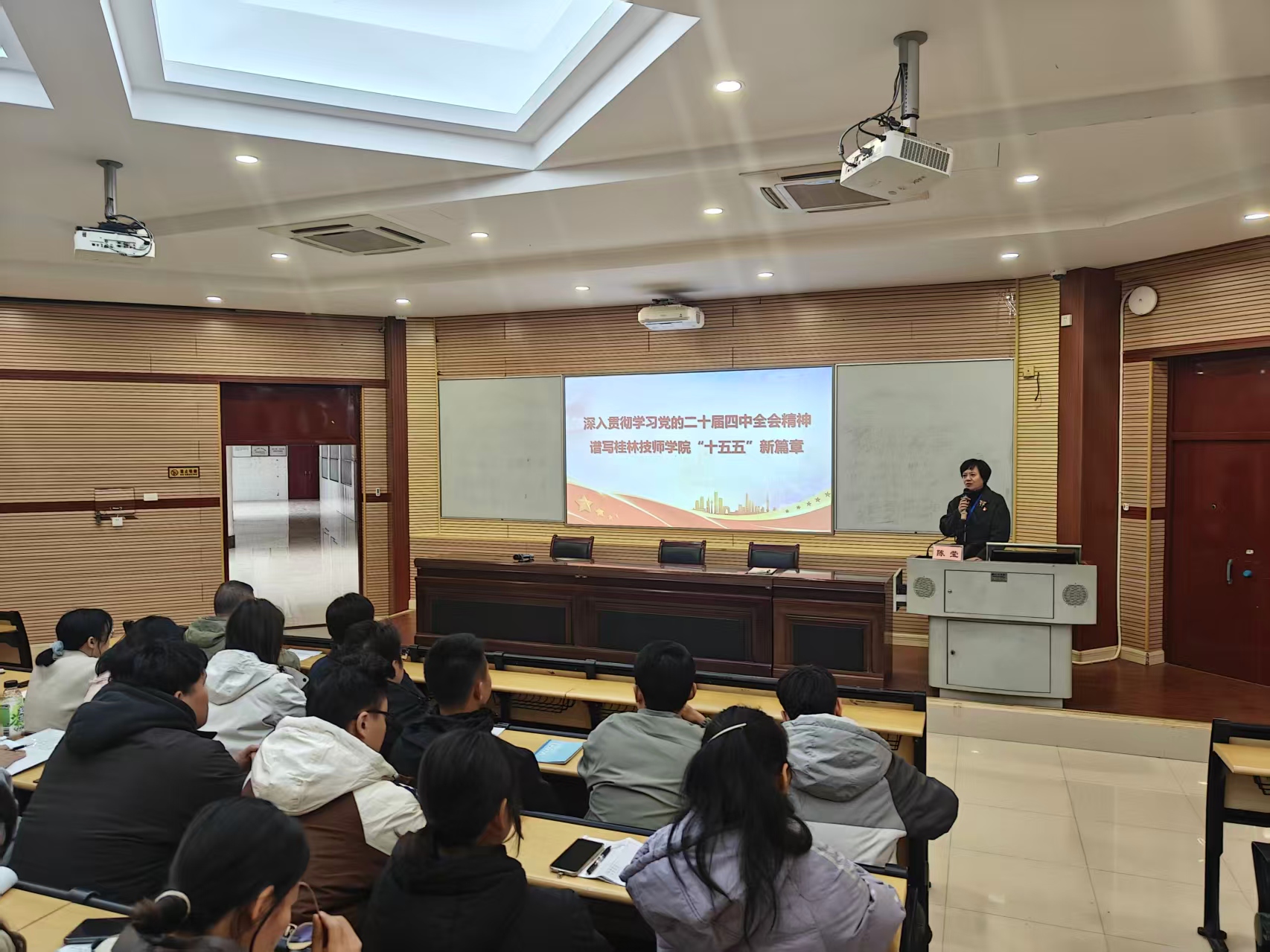 11月18日下午,学院党委委员、纪委书记、副院长陈莹以“深入学习贯彻党的二十届四中全会精神 谱写桂林技师学院‘十五五’新篇章”为主题,为全院青年教职工讲授了专题党课。
