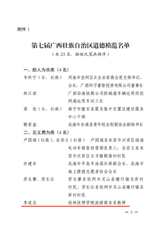 近日,中共广西壮族自治区委员会宣传部发布《关于表彰第七届广西壮族自治区道德模范的决定》,市人社系统教师李凌志荣获“见义勇为类”自治区道德模范称号。这一荣誉不仅是对李凌志个人英勇行为的高度肯定,更是对新时代人民教师践行社会主义核心价值观、弘扬社会正气的生动诠释。