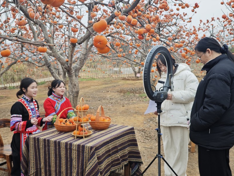 作为恭城月柿产业核心示范村,莲花村的月柿产业已实现全链开发与品牌化发展。调研首站,师生走进柿子园,实地了解月柿种植技术后,电子商务专业学生立刻搭建临时直播场景,以“云端逛柿园”的形式向网友推介月柿,细致讲解果实特点与产业故事;计算机动画制作专业学生穿梭林间,捕捉果实形态、田园风光等视觉素材,为产业宣传积累灵感。