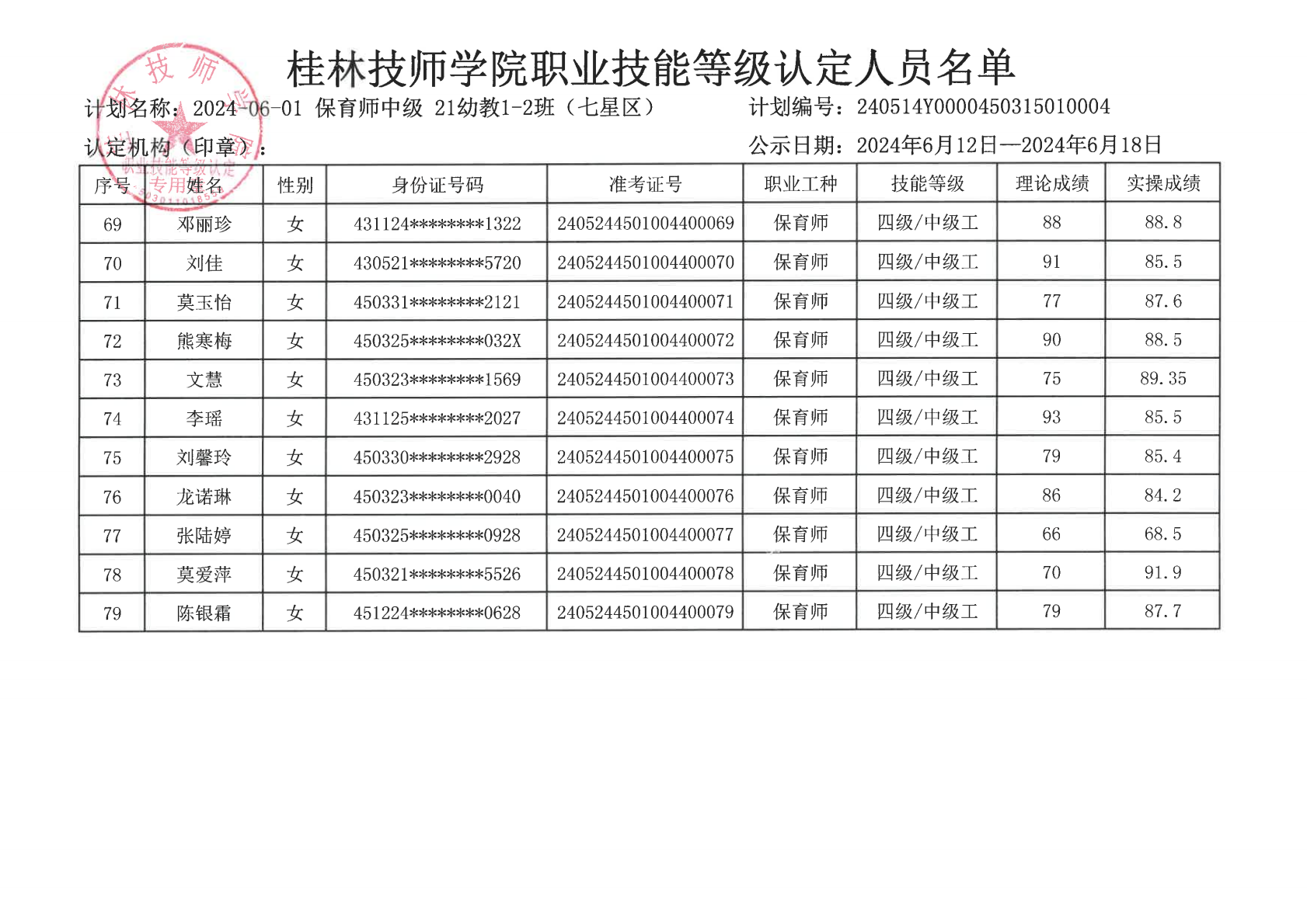 桂林技师学院职业技能等级认定240514Y0000450315010004批次成绩公示
