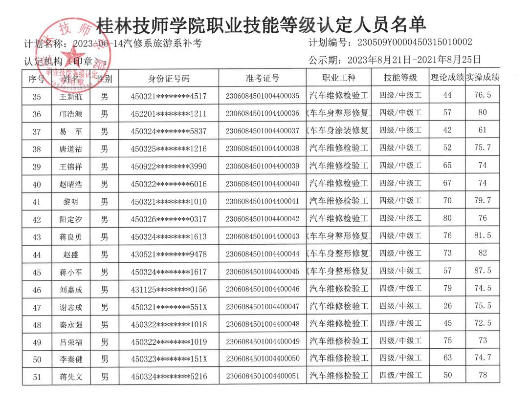桂林技师学院职业技能等级认定230509Y0000450315010002批次成绩公示