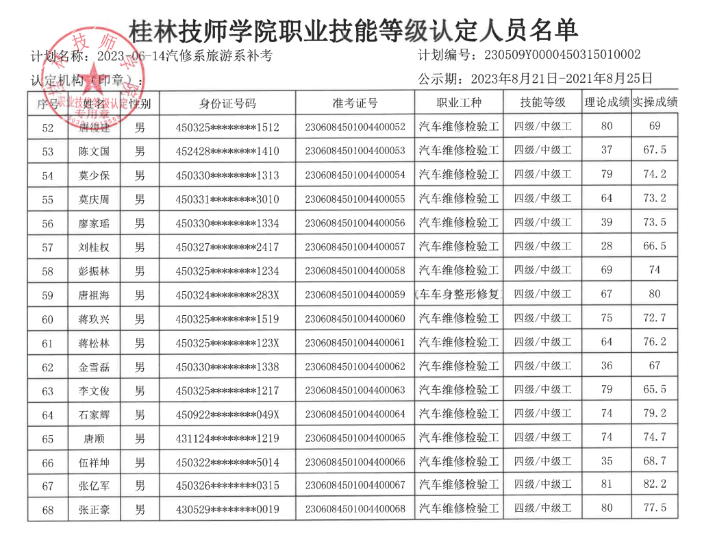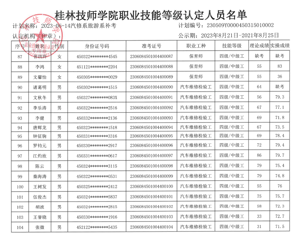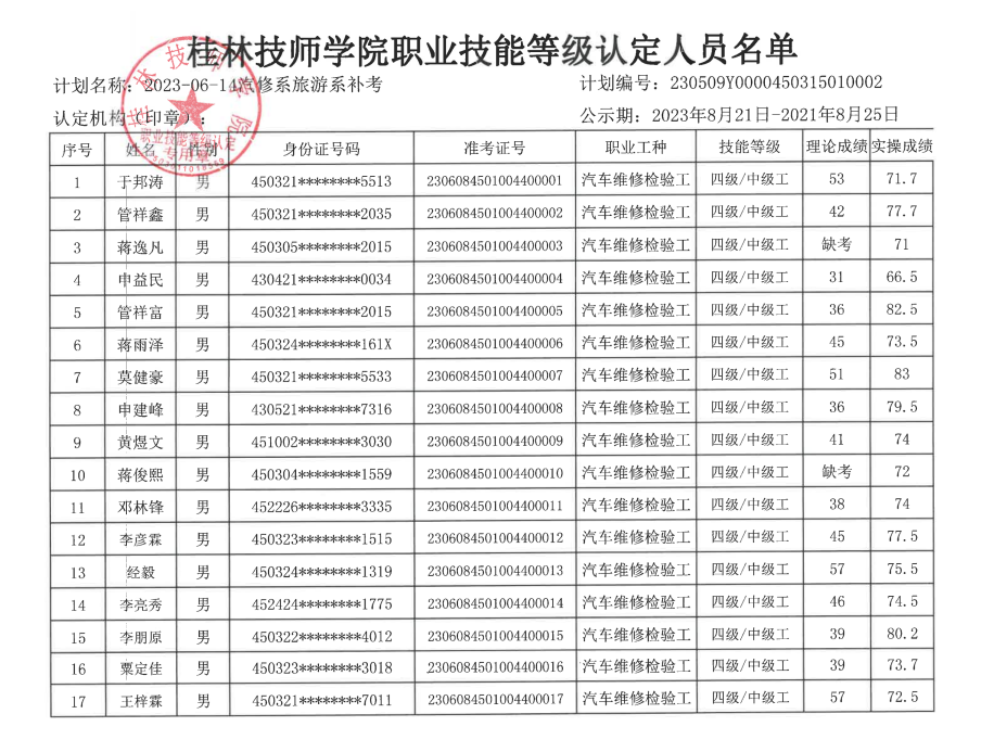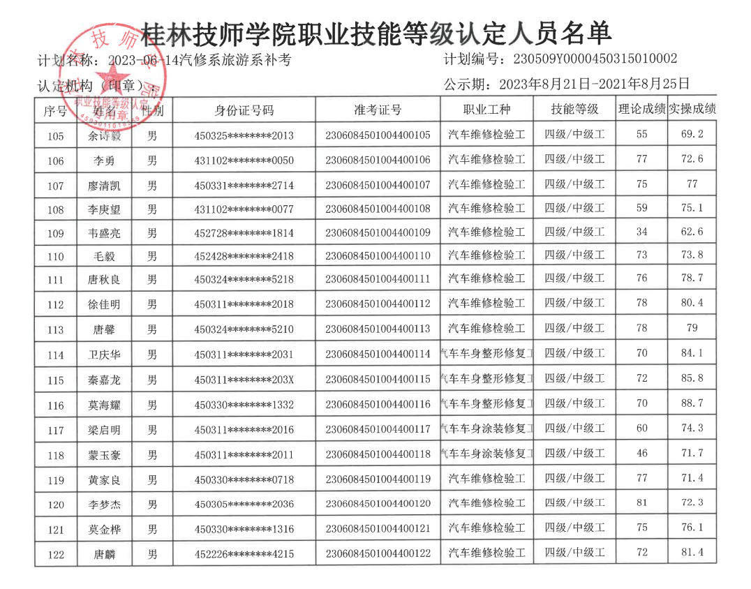 桂林技师学院职业技能等级认定230606Y0000450315010004批次成绩公示