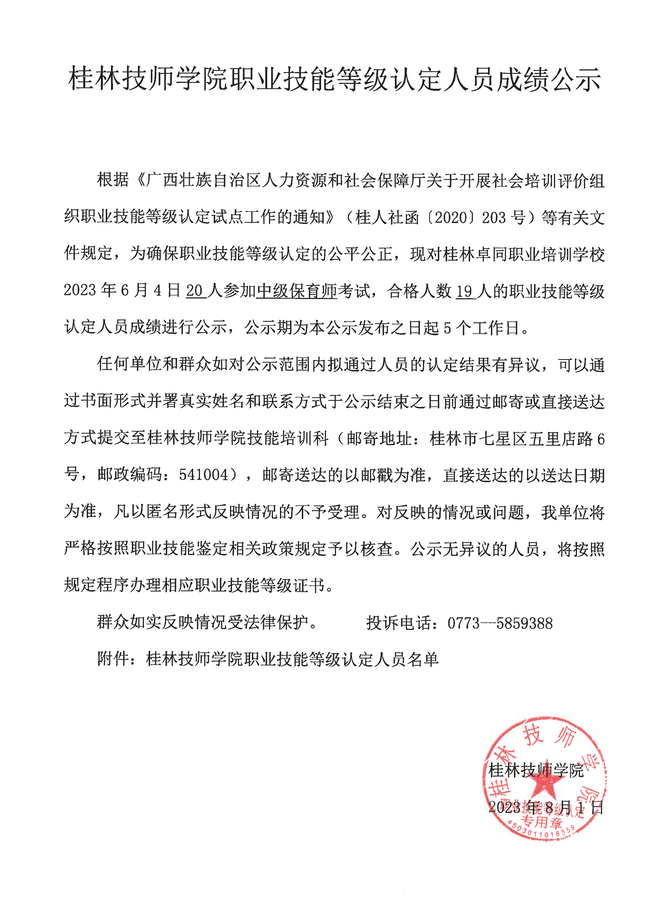 桂林技师学院职业技能等级认定230602Y0000450315010003批次成绩公示