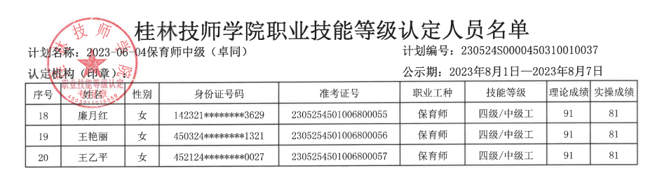 桂林技师学院职业技能等级认定230530S0000450310010039批次成绩公示