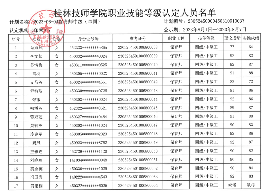 桂林技师学院职业技能等级认定230524S0000450310010037批次成绩公示