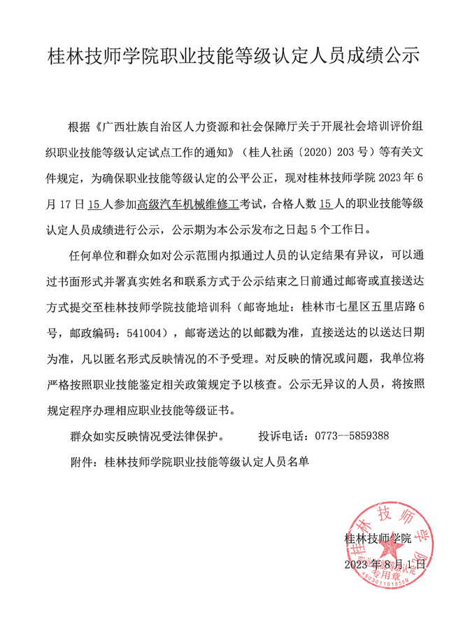桂林技师学院职业技能等级认定230626S0000450310010041批次成绩公示