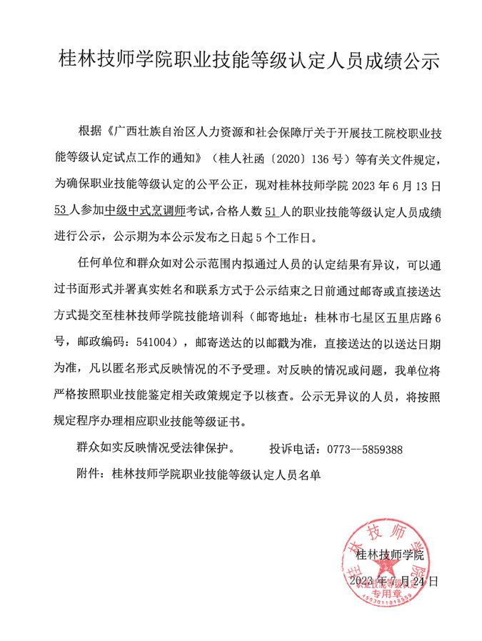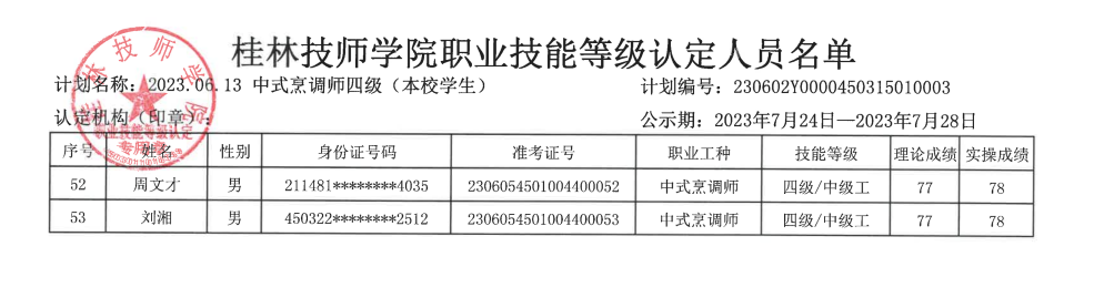 桂林技师学院职业技能等级认定230607Y0000450315010005批次成绩公示