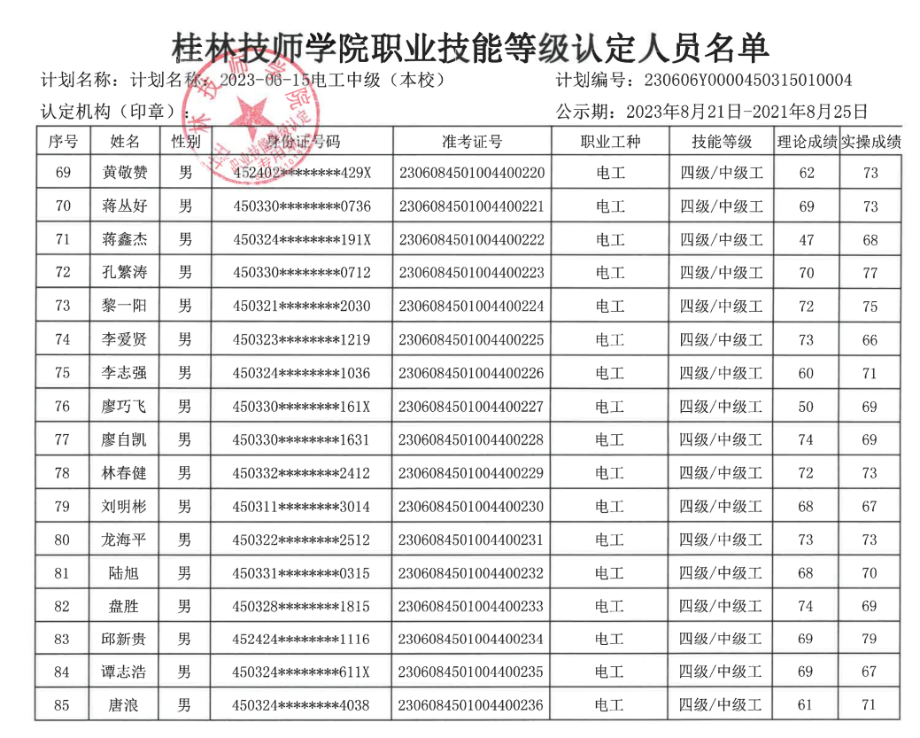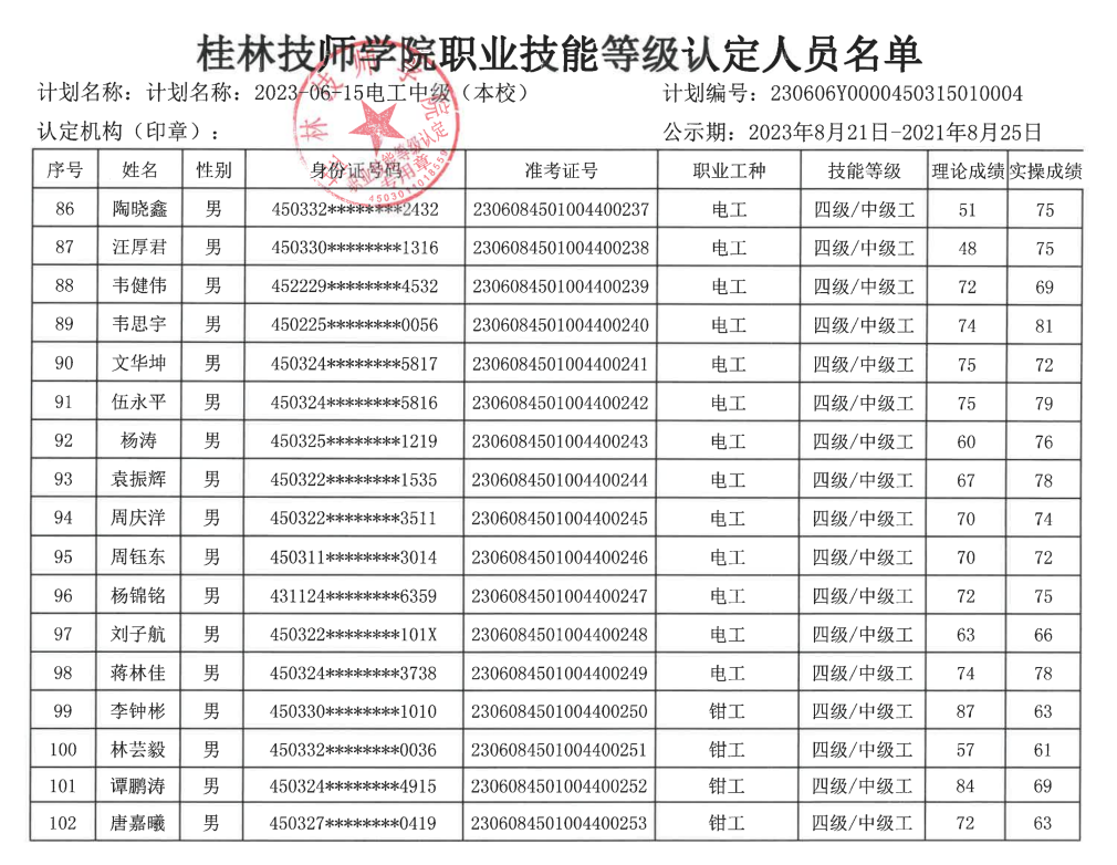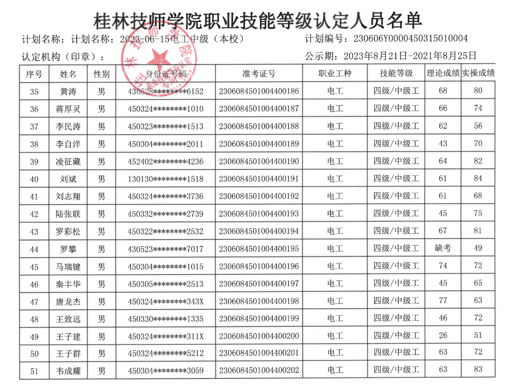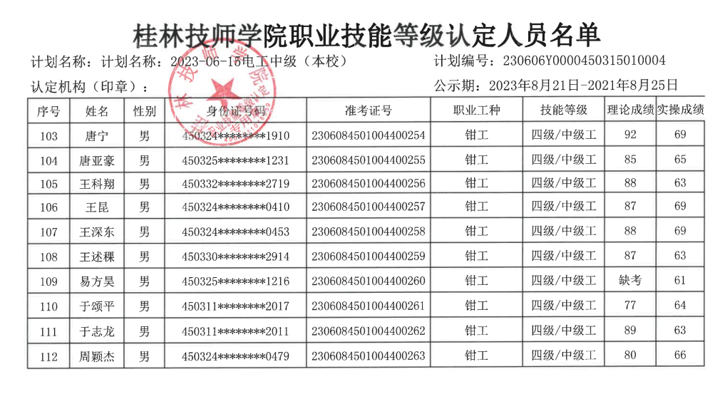 桂林技师学院职业技能等级认定230606Y0000450315010004批次成绩公示