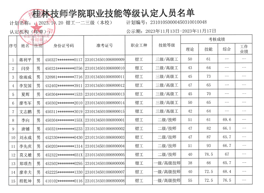 桂林技师学院职业技能等级认定231010S0000450310010048批次成绩公示