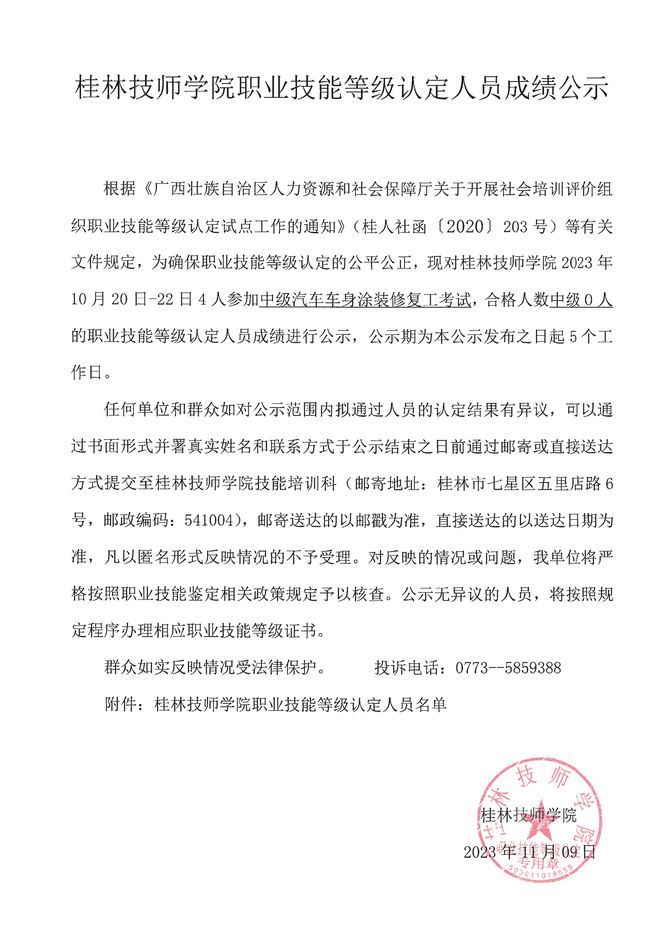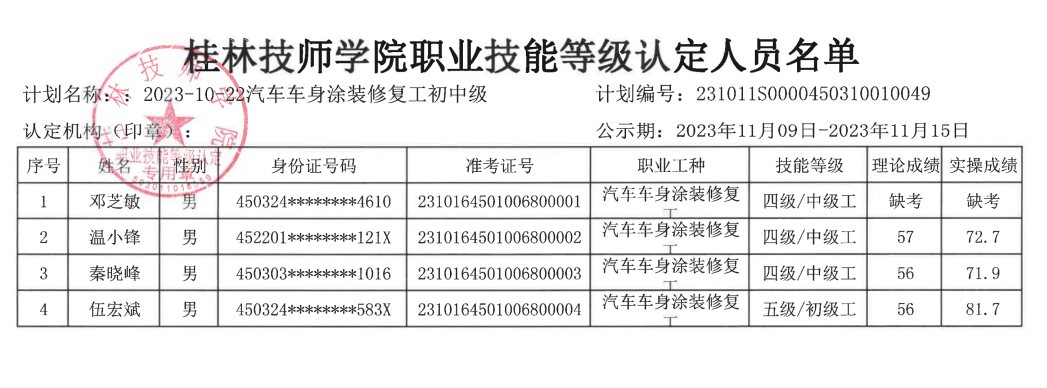 桂林技师学院职业技能等级认定231011S0000450310010049批次成绩公示