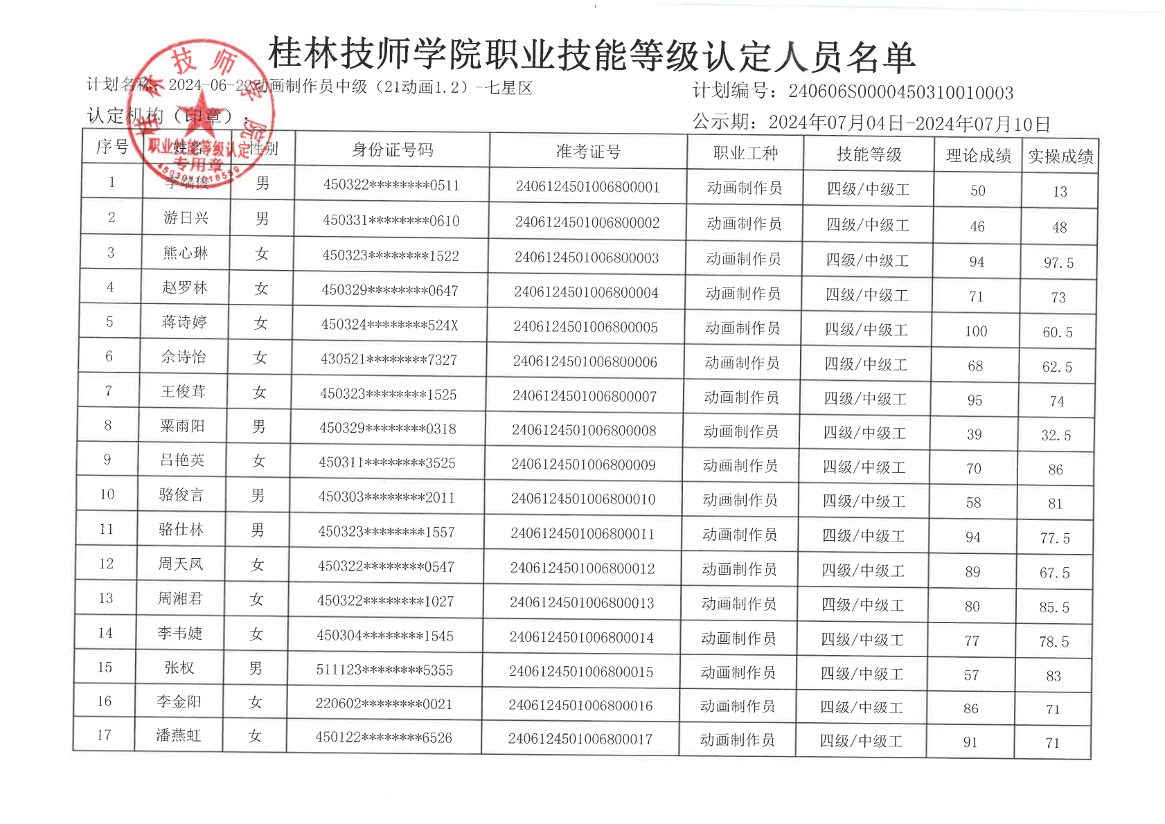 桂林技师学院职业技能等级认定240617Y0000450315010008批次成绩公示