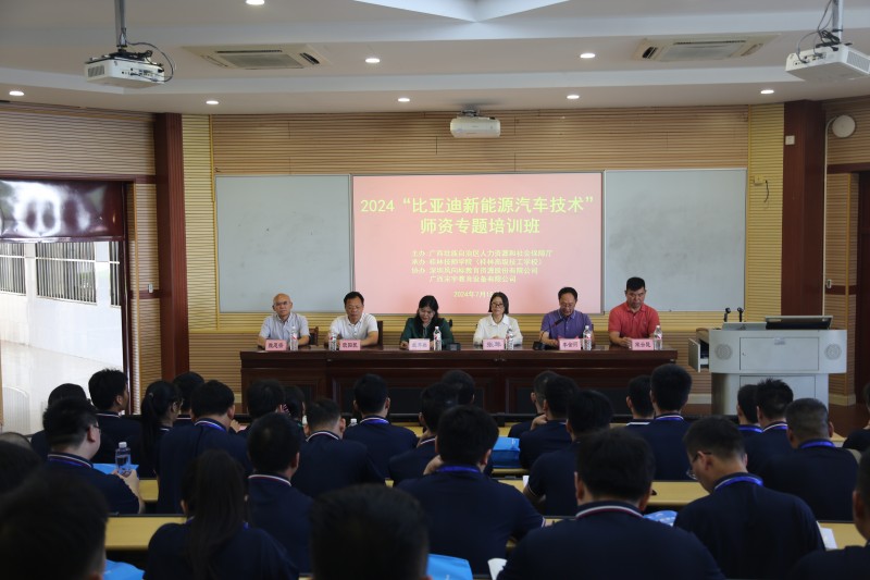 2024年7月15日上午,由广西壮族自治区人力资源和社会保障厅主办,桂林技师学院承办,深圳风向标教育资源股份有限公司、广西宋宇教育设备有限公司协办的2024年广西“比亚迪新能源汽车技术”师资专题培训在桂林技师学院顺利开班。此次专题培训,旨在贯彻落实《关于进一步加强新时代高技能人才队伍建设的若干措施》,推动技能强企,强化新能源、制造业企业技术技能人才供给,提升我区教师新能源汽车技术的教学能力。